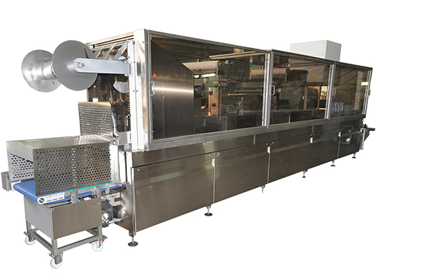 Línea ultralimpia de termoformado, llenado ultralimpio y termosellado que incluye una unidad de descontaminación del alimento durante el envasado. Esta tecnologia permite alargar la frescura del producto y su vida útil por lo que se disminuyen las perdidas de alimento durante la distribución.